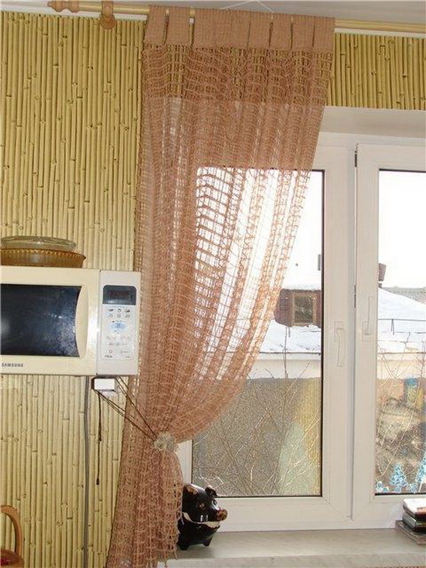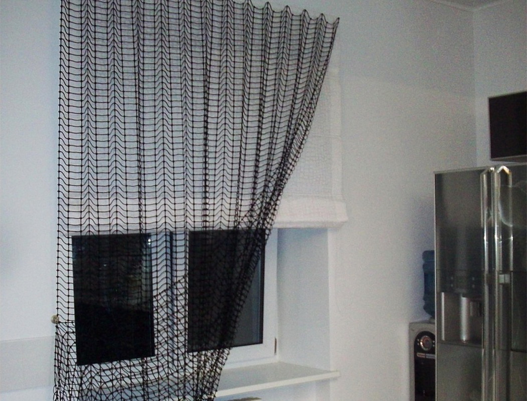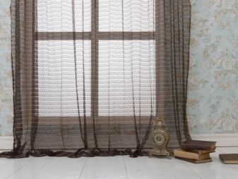Unter den Arten von Tüll Mesh ist erwähnenswert feinmaschig und große Mesh-Modelle. Das Gitter mit Stickerei heißt französische Spitze, es wird oft im Design des Küchenfensters verwendet. Das Gitter mit großen rechteckigen Zellen besteht aus dicken Fäden und sogar Spitze. Unabhängig davon kann solcher Tüll im Ethno-Stil, drinnen im Country-Stil gefunden werden. Die eigentliche Dekoration des Fensters kann als Dekoration des Fensters mit einem Gitter über dicke Vorhänge bezeichnet werden. Gleichzeitig können Tüll und Portiere verschiedene Farben haben, aber von einer Farbe, und das Netz sollte auf den Boden gefaltet werden.
