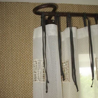 Alle, selbst die einfachsten Vorhänge werden elegant aussehen, wenn Sie ihnen interessante Details hinzufügen. Als Halter werden Klammern verwendet, die mit Steinen, Perlen verziert sind. Sie sind nicht unbedingt aus Stoff, sie können Ledergürtel, Ketten, Bänder mit Quasten sein. Für solche im englischen Stil eingerichteten Fenster im Haus ist ein Ehrenplatz gegeben. Anziehschlingen kann auch eine echte Kunst sein - ergänzt durch Bögen, Perlen,mit Knoten bringen sie eine Prise ins Innere und dienen als echte Dekoration des Raumes.
