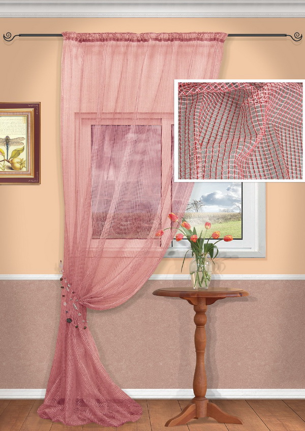 Schwerelos durchscheinende Materie kann jeden Raum sofort dekorieren. Für die Herstellung von Schleier verwenden Seide, Flachs, Baumwolle, die es natürlich macht. Diese Art von Tüll ist sehr weich und formbar, was es leicht macht, ihm die gewünschte Form zu geben, um schöne Falten zu machen. Der Schleier gilt als der dichteste aller Tüllarten, er lässt das Licht nicht gut durch. Diese Fähigkeit erlaubt ihr, den Schleier als ein einzelnes Element in der Gestaltung des Fensters zu verwenden. Das interessanteste solche Dekor wird im Schlafzimmer, Kinderzimmer schauen. Der Schleier verleiht dem Raum Leichtigkeit und Leichtigkeit. Das Material ist einfach zu benutzen - der Schleier sammelt keinen Staub, es ist sehr leicht zu waschen.