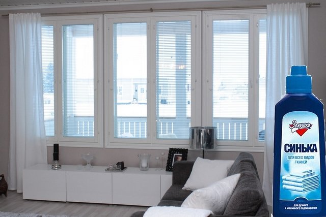 Wenn es außerdem schlecht ist, das Pulver während der Herstellung der Lösung zu rühren, können Spuren auf dem Material verbleiben. Es ist erwähnenswert, dass Bläuepunkte nicht angezeigt werden. Deshalb wird empfohlen, die Vorhänge von Hand zu waschen, da die Maschine das Bleichmittel nicht immer vollständig auflösen kann.
