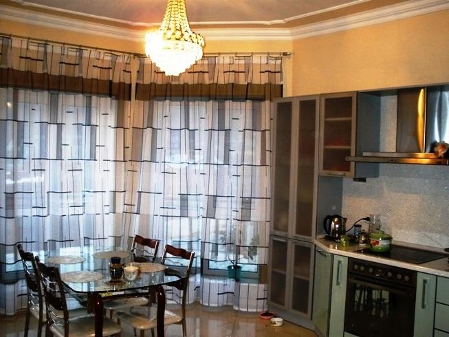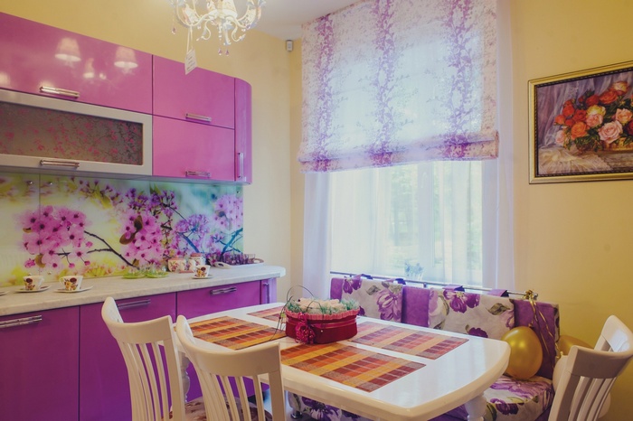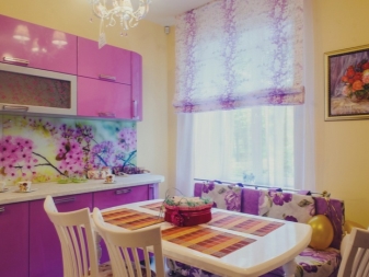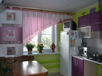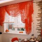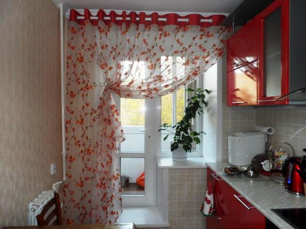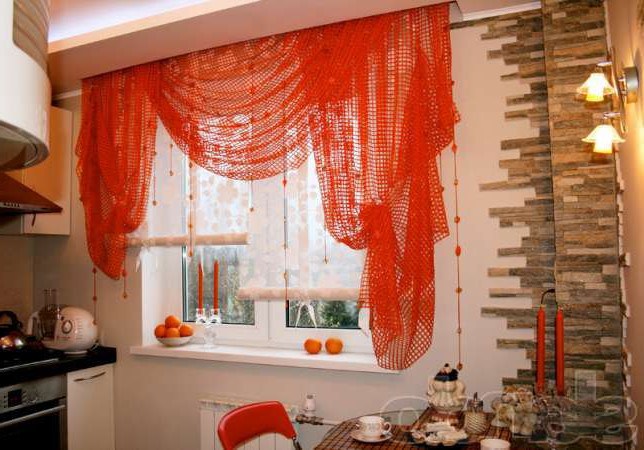 - Für die Küche Ein kurzer leichter Vorhang, wie ein Microgrid oder Polyester Tüll, reicht aus. Es kann mit Bildern von Beeren, Früchten, Küchenutensilien und Haustieren dekoriert werden.
