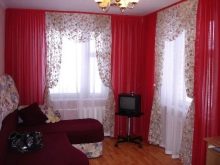 - Roter Vorhang Es wird ausschließlich in Kombination mit einer Kontrastfarbe verwendet, die die Helligkeit glättet. Rote Farbe wird im Inneren angebracht sein, was ein paar rote Akzente sein wird.