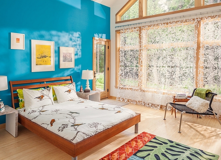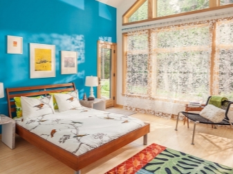- Fügen Sie Leichtigkeit in den Raum wird helfen türkisfarbener Vorhang mit schneeweißen Mustern. Ein gelbes Tuch wird den Raum beleben.
