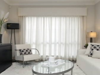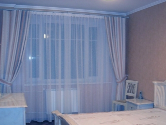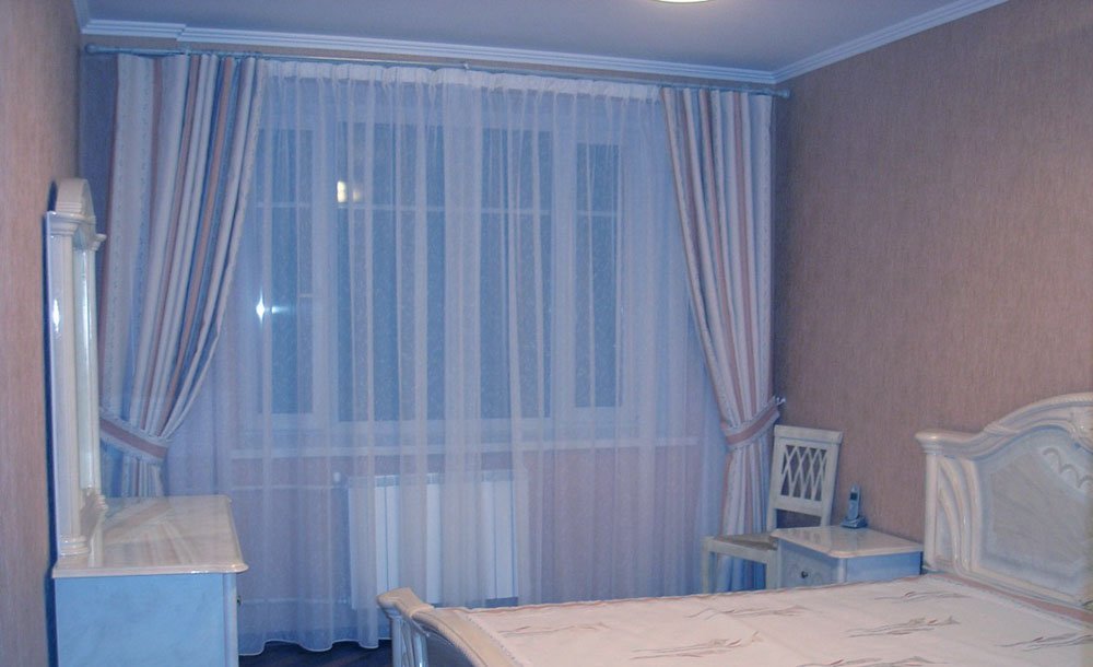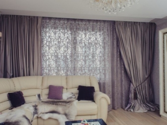 Leichte Netzvorhänge sind jetzt in Mode, die über schwere Vorhänge gehängt werden. Es ist wichtig, dass alle Elemente in demselben Farbbereich entworfen sind und sich nur um einen oder zwei Töne unterscheiden. In diesem Fall kann die Länge der Leinwände so sein, dass sie den Boden erreicht oder ein wenig auf dem Boden liegt.