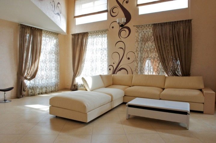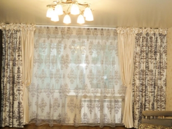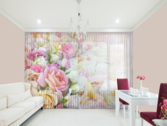 Um den hellen und reichen Innenraum zu glätten, müssen Sie helle Tüllvorhänge verwenden. Dies können Beige-, Weiß- und Rosatöne sein. Das Produkt kann mit Mustern oder einem dezenten Ornament verziert werden, um den Lichtvorhängen eine besondere Note zu verleihen. In den letzten Jahren begannen Vorhänge in Streifen oder mit großen Blumen am Boden der Leinwand aus der Mode zu kommen.