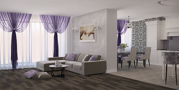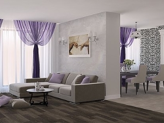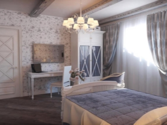 - Beige und brauner Stoff wäre es angemessen, in einem klassischen Stil zu suchen. Aber lila oder lila schmücken das Zimmer im provenzalischen Stil.