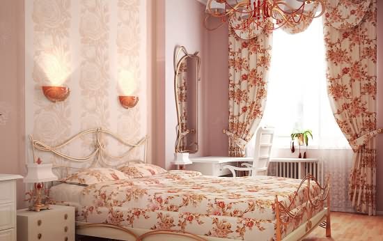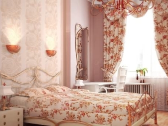 Im Schlafzimmer kann man nicht zu helle Tapeten und Vorhänge verwenden. Es ist am besten, den Tüll des Farbtons auszuwählen, der im Muster der Tapete ist. So erhalten Sie einen ganzheitlichen und harmonischen Raum.