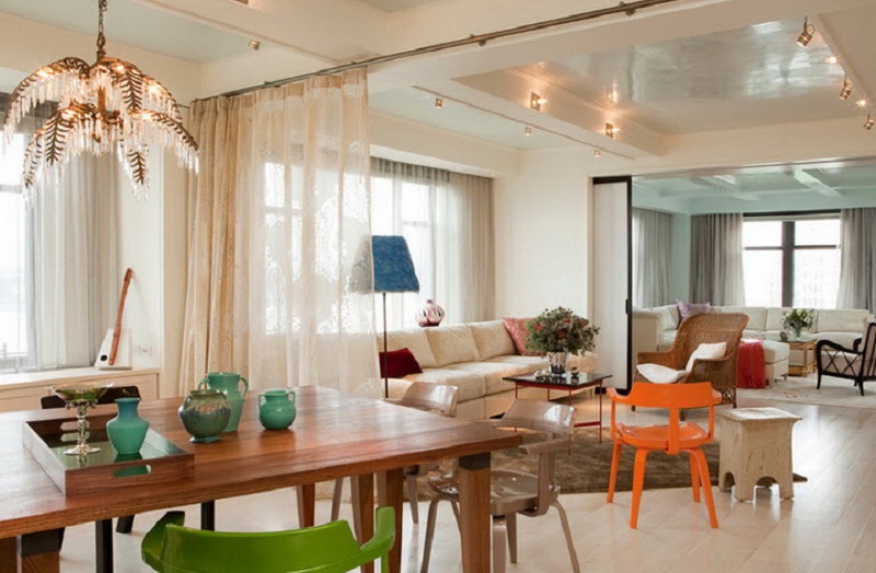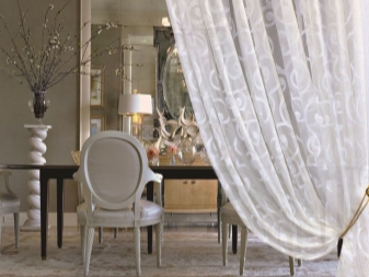 Die Vielfalt der Formen und Farben der Tüllvorhänge ermöglicht es Ihnen, jedes Interieur mit ihnen zu dekorieren. Wenn der Raum keinen bestimmten Stil hat, kann er mit einem Vorhang beliebiger Farbe dekoriert werden. Natürlich wird die weiße Farbe nie ihre Relevanz verlieren, so dass sie mit jeder Dekoration und jedem Möbelstück kombiniert werden kann.