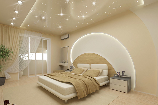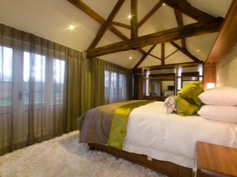 Designern wird empfohlen, komplexe Vorhänge in der Gestaltung von Fenstern im Schlafzimmer zu verwenden. Dies ist notwendig, um den Raum jederzeit verdunkeln zu können. Ein Beispiel für Kürze und Einfachheit kann als weißer Tüll in Kombination mit dicken dunklen Vorhängen angesehen werden.