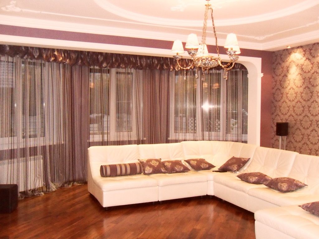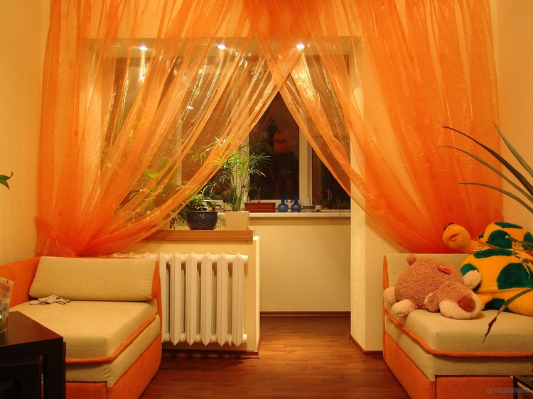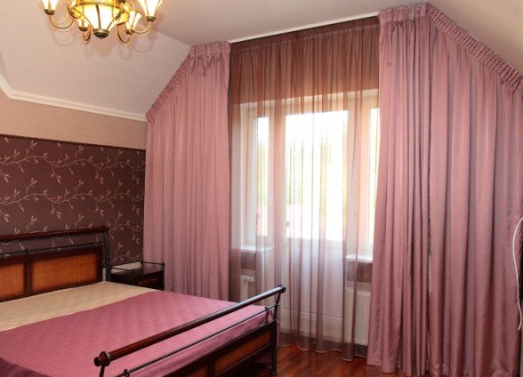 - Traditionelle Vorhänge haben Länge bis zum Boden Sie werden helfen, die Höhe des Raumes visuell zu erhöhen, aber um sie zu installieren, müssen sie das Niveau der Decke ausrichten.