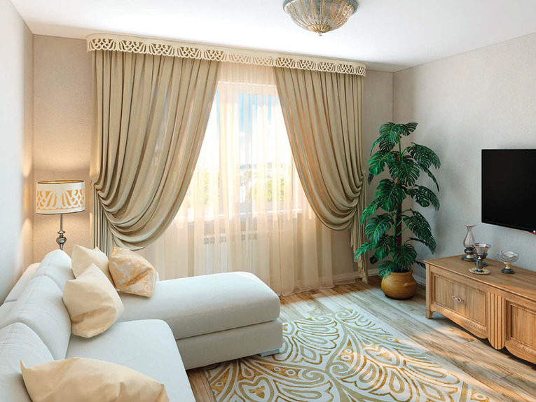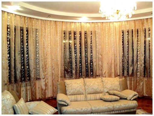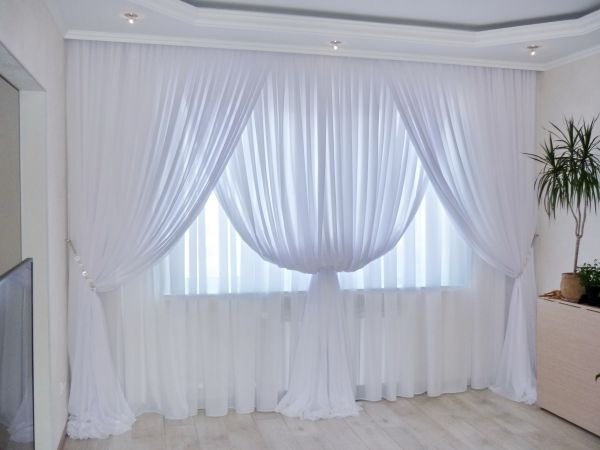 Wenn die Fenster im Wohnzimmer komplexe Elemente haben, dann ist ein Schleier für sie geeignet.Es kann als Hauptmaterial verwendet werden und aus mehreren Elementen bestehen. Ein langer, plissierter Tüll verleiht dem Raum ein Gefühl von Luxus.