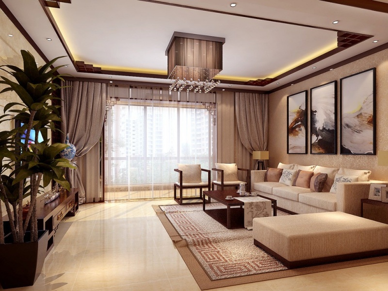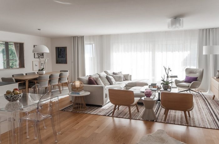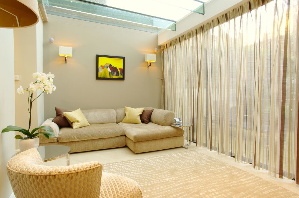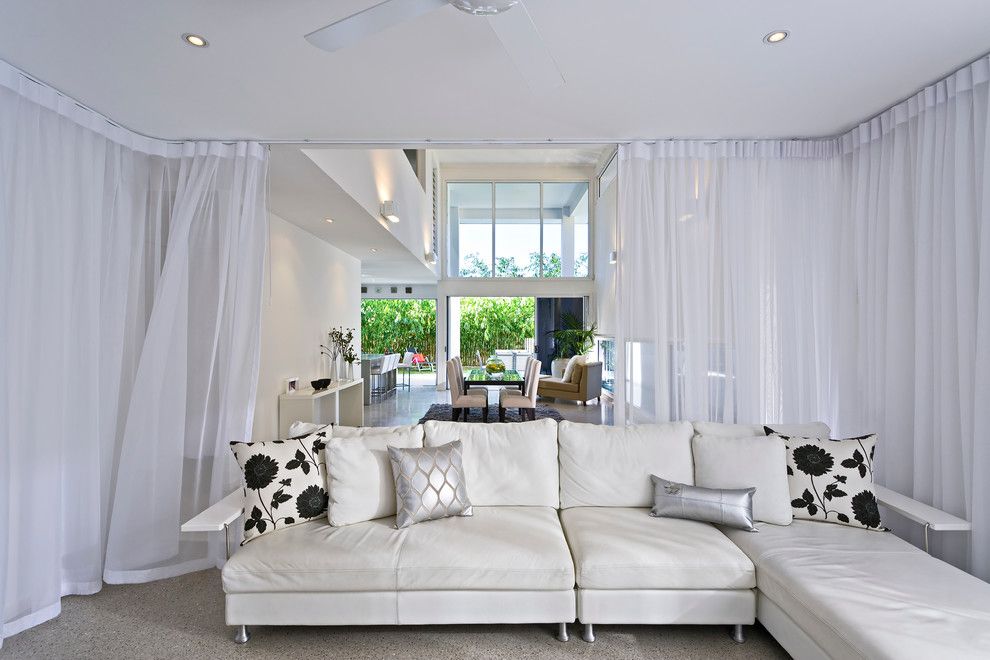 Ein schöner Vorhang aus Guipure-Einlagen ist notwendig, um die Raffinesse des Wohnzimmers zu unterstreichen.