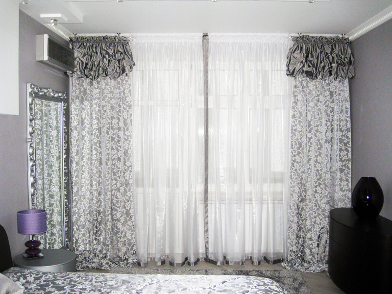 Die Kombination mehrerer verschiedener Farben wird dazu beitragen, ein einzigartiges Design des Raumes zu schaffen. Zum Beispiel werden schneeweißer Tüll und schwarze Vorhänge gut gegen die grauen Wände aussehen. Um das Fenster vom Rest des Innenraums abzuheben, müssen Sie helle Vorhänge oder gemusterten Tüll verwenden. Aber satte Farben können den Raum optisch quetschen, daher sollte es eine Fülle von hellen Farben im Raum geben.