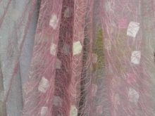 Meistens wird diese Art von Tüll aus Organza hergestellt, aber manchmal gibt es auch eine Kombination aus synthetischen und Seidenfäden.Solches Material ist mäßig transparent, aber gleichzeitig dauerhaft, es glänzt in der Sonne mit erstaunlichen Ebbe-Gezeiten.