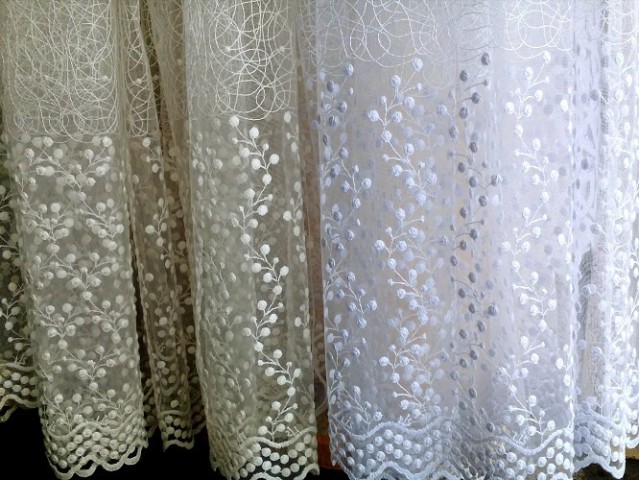 Unbestreitbarer Vorteil - die Fähigkeit, den Staub nicht zu verzögern. Besitzer des "Spinnennetzes" sagen, dass das Material nicht schmutzig aussieht, auch wenn Sie es für eine lange Zeit nicht löschen. Schmutz legt sich nicht auf den Stoff, und der Tüll sieht aus, als wäre er vor ein paar Stunden aus dem Salon geholt worden.