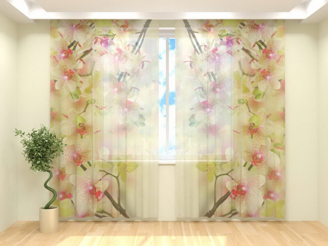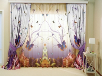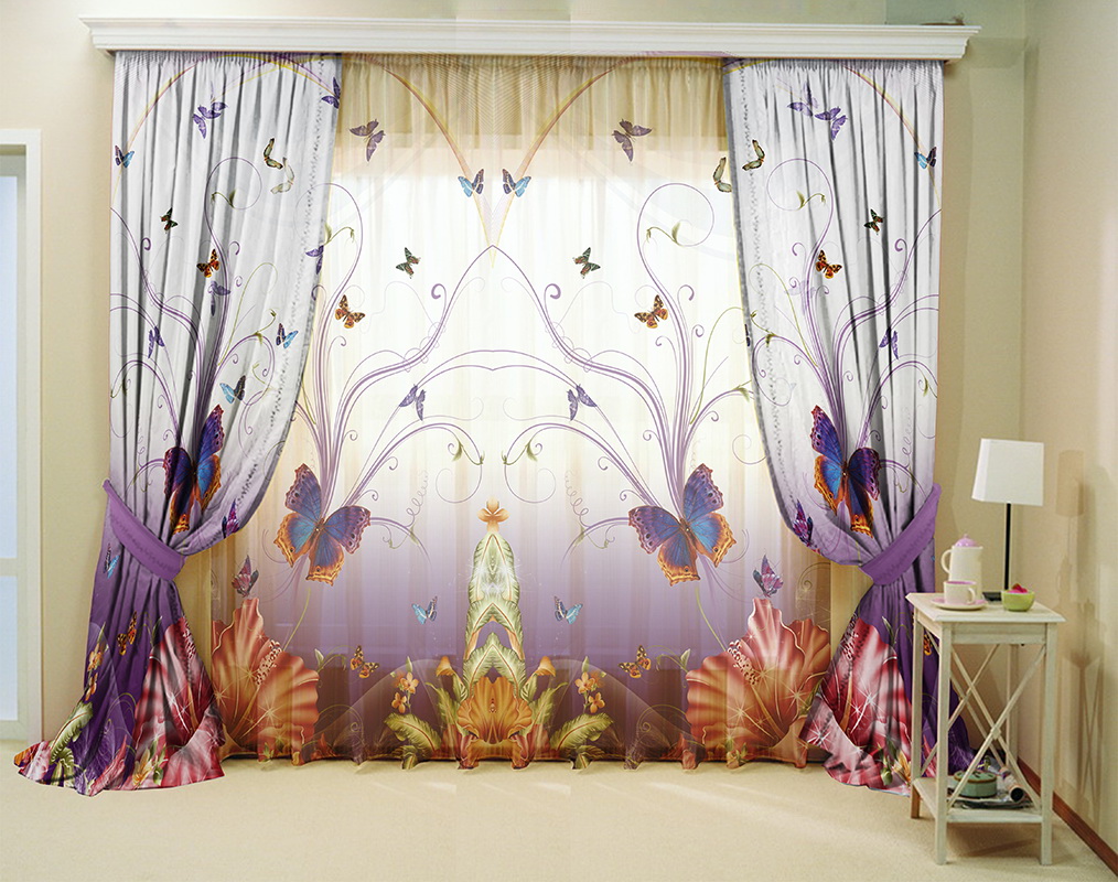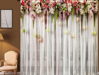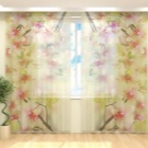 Wählen Vorhänge mit einem Muster, sollten Sie darüber nachdenken, welches Thema es sein sollte. Es hängt von dem Raum ab, in dem sie hängen werden, vom allgemeinen Stil der Wohnung, von den Geschmackspräferenzen ihrer Bewohner. Wenn Sie die Natur lieben, achten Sie auf Tüll mit Schmetterlingen, Vögeln, Blumen - Rosen, Mohn, Kamille, Orchideen, Sakura sind in dieser Hinsicht sehr beliebt. Der minimalistische Stil kann durch lakonische Vorhänge mit einem abstrakten geometrischen Muster ergänzt werden.