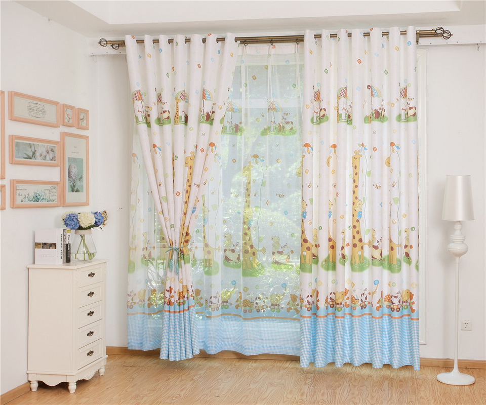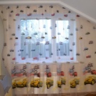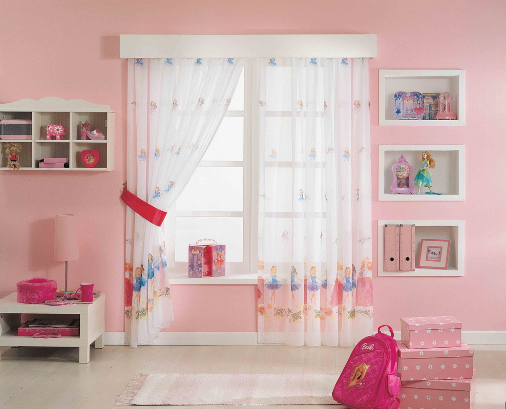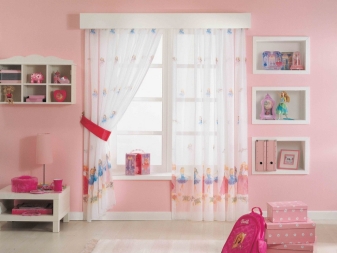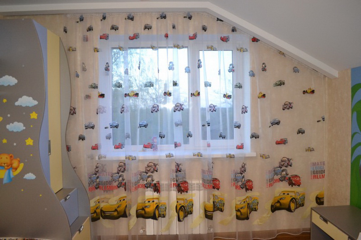 - Im Kinderzimmer Sie können Tüll mit hellen Farbmustern, die Comicfiguren, niedlichen Tiere, Puppen oder Schreibmaschinen sind;