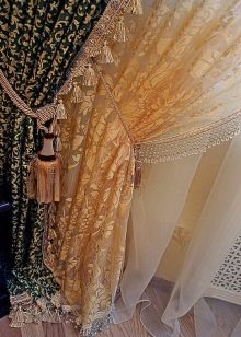 - Wenn Sie Vorhänge mit einem schönen komplexen Ornament, mit bedrucktem Druck oder schwerer Stickerei wählen - wählen Sie so einfach wie möglich Tüll. Das Maximum, das auf ihm sein kann, ist derselbe Druck wie auf Vorhängen, nur blasser und in kleineren Mengen, zum Beispiel, nur ein Teil des Musters. Sie sollten das Fenster und das Innere als Ganzes nicht überladen, zu bunte Vorhänge hängend.