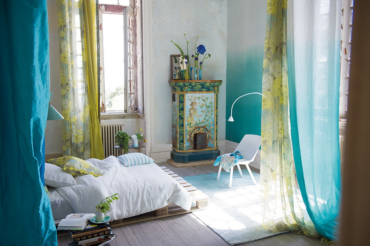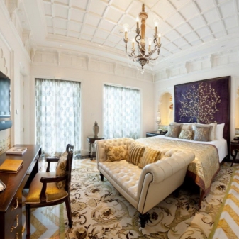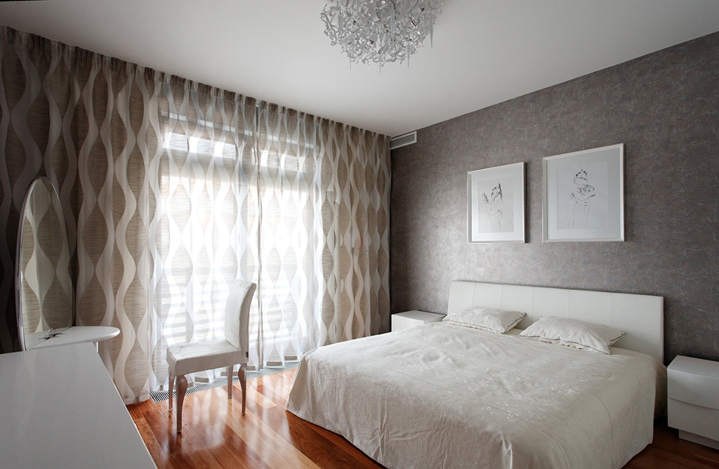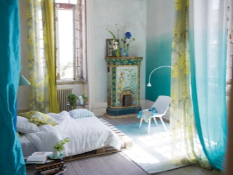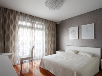 - Für das Schlafzimmer nehmen Sie einen dichten monophonen Tüll oder Stoff mit einem großen Muster auf. Die Kombination von Tüll und Vorhängen wird in diesem Raum relevant sein;