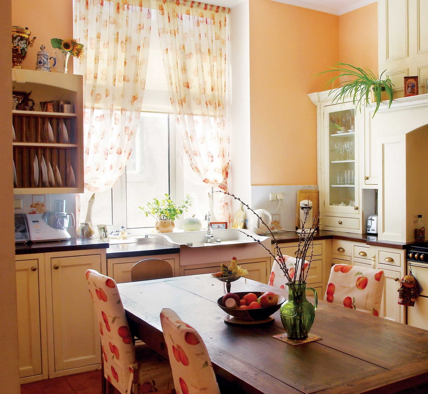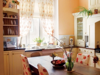 - In der Küche Es ist am besten, kurze Vorhänge zu hängen, die Fensterbank in einem Käfig, Streifen oder einer Blume zu erreichen;