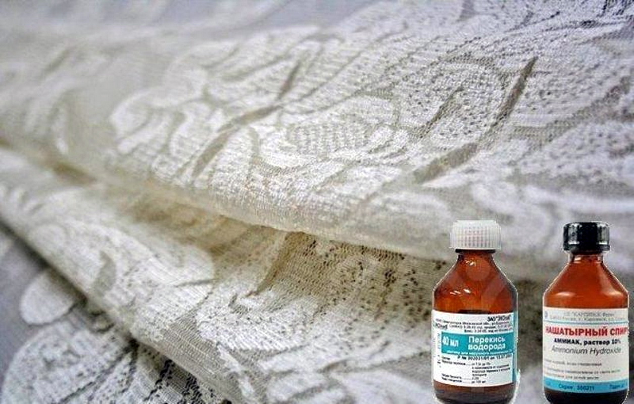 - Um Grau zu entfernen und zu Vorhängen zurückzukehren, hilft ein Weiß, Ammoniak und Wasserstoffperoxidin Wasser gelöst. Sie können auch gekaufte Whitening-Produkte verwenden, aber stellen Sie sicher, dass ihre Wirkung empfindlich ist und die Zusammensetzung zum Bleichen von dünnen Stoffen geeignet ist.