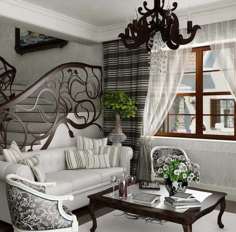 Tüll mit Monogrammen, Schnörkel sieht schön aus, dieses Muster erinnert an Paläste und mittelalterliche Burgen. Für das Kinderzimmer können Sie einen Vorhang mit einem niedlichen Druck in Form von Autos, Schiffen, Flugzeugen und Raumschiffen aufnehmen - für Jungen; in Blüte, mit Bären, Hasen oder Kätzchen für Mädchen.Für Liebhaber stilisierter Interieurs haben moderne Textilhersteller einen Service erfunden, wie zum Beispiel ein Druckmuster oder einen Fotodruck - mit speziellen Pigmenten wird ein Muster auf den Tüllstoff aufgebracht, was alles sein kann.