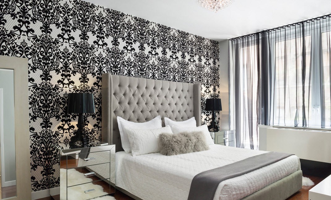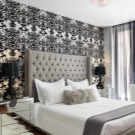 Der Farbton von Tüll im Innenraum sollte mit der Farbe von dekorativen Kissen, Tagesdecken und anderen Textilien im Inneren des Schlafzimmers harmonieren. Kürzlich wurden Vorhänge mit einem Schwarz-Weiß-Druck populär. Diese klassische Kombination von Schwarz und Weiß ist immer wahr.