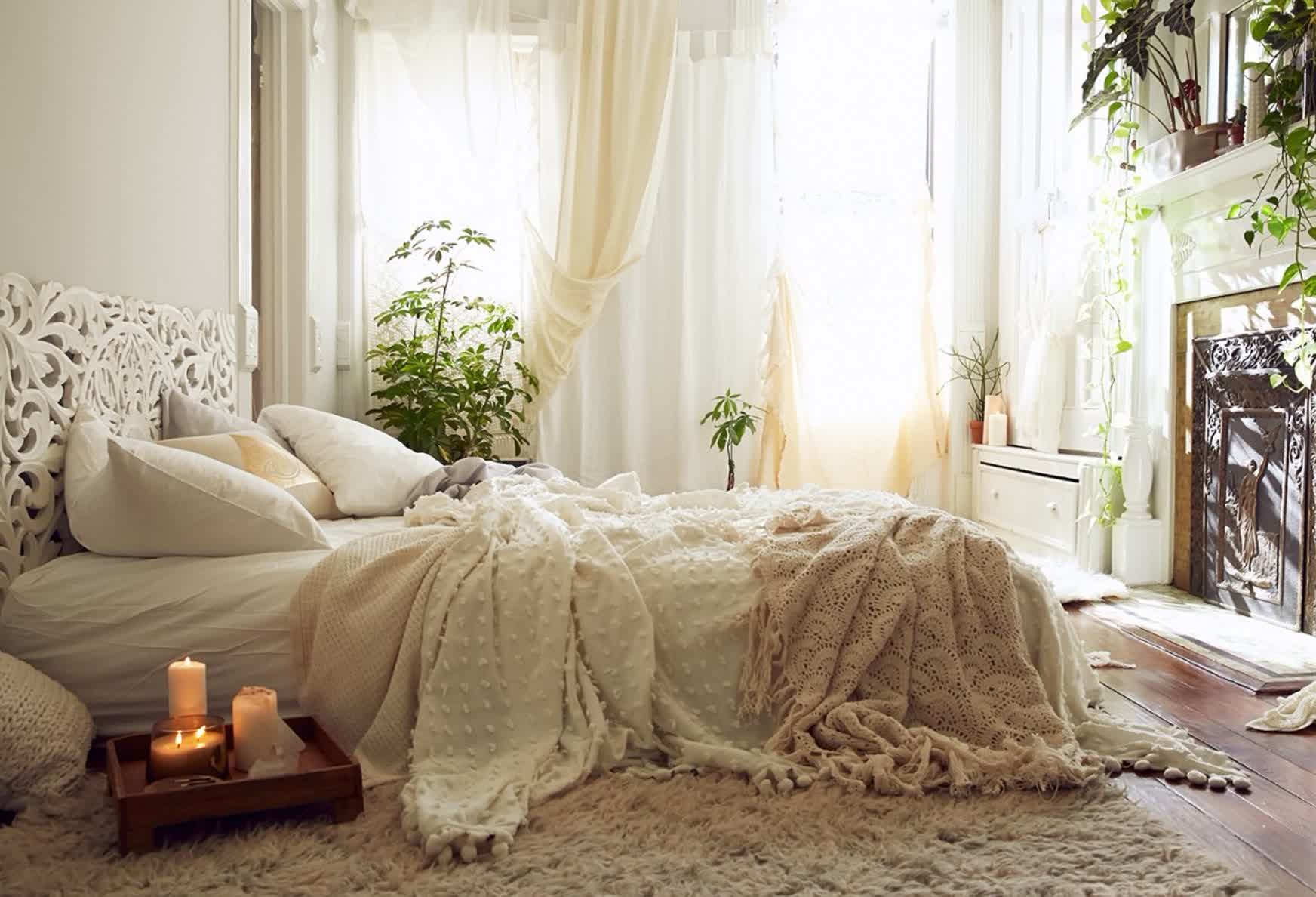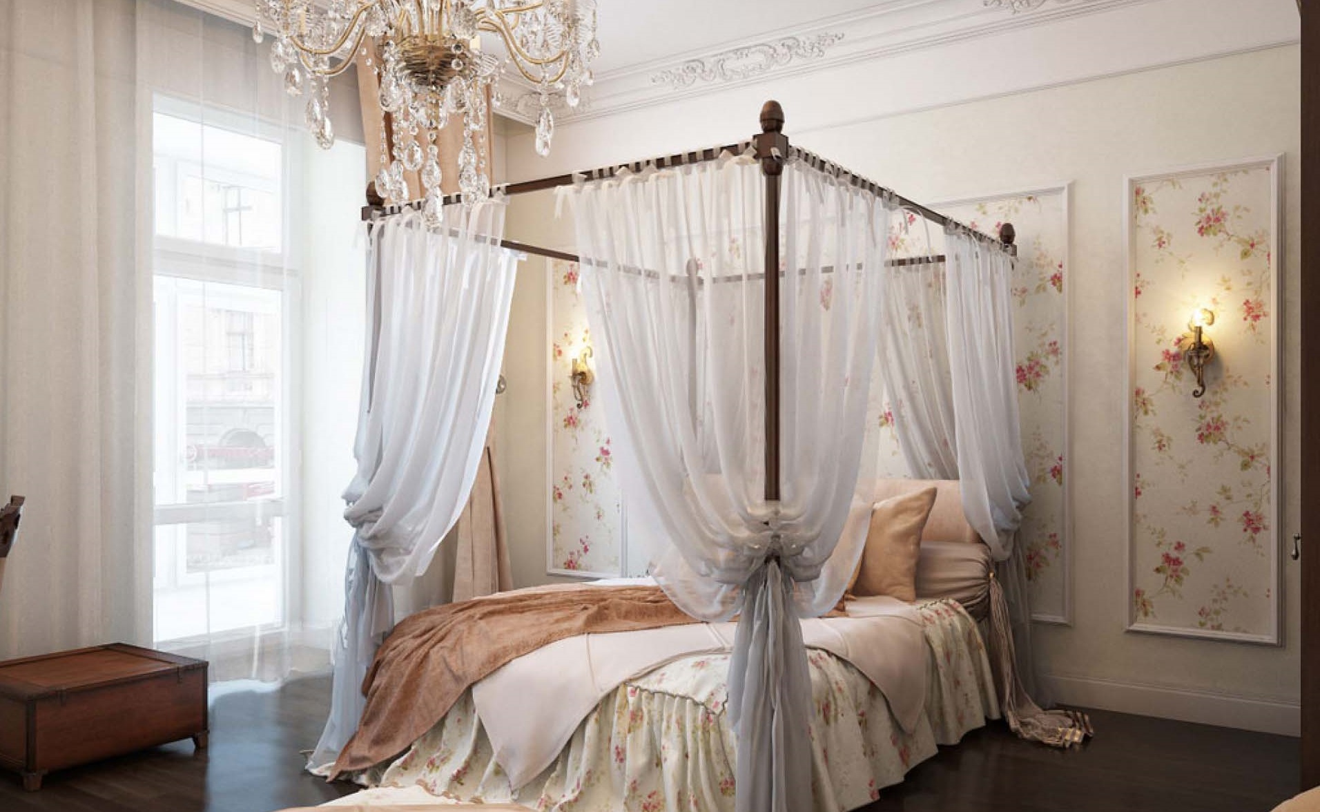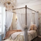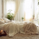 - Osten. Orientalische Farbgebung im Inneren des Schlafzimmers ist typisch für Tüllvorhänge. Es ist ein transparenter Stoff mit einem floralen Ornament, florale Motive sind möglich, zum Beispiel Tulpen. Tüll in hellen Farben ist hier geeignet. Und im Schlafraum im japanischen Stil kann der leichteste Tüll mit Rollos kombiniert werden, die für die nötige Beschattung sorgen.