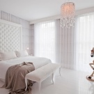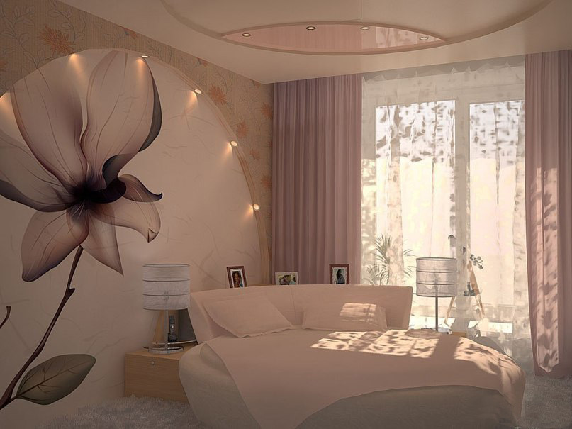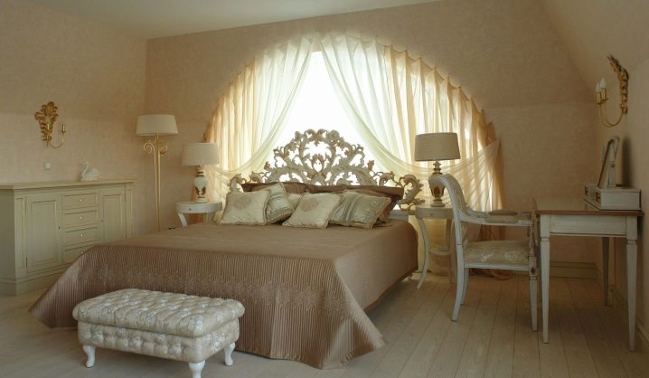 Wenn in Ihrem Schlafzimmer eine gewölbte Fensteröffnung ist, muss diese betont werden.. Es gibt viele Optionen für Vorhänge über dem Bogen. In der ersten Ausführungsform müssen sie die Konfiguration der Öffnung wiederholen. Eine andere Möglichkeit besteht darin, gewöhnliche rechteckige Tüllvorhänge über den Bogen zu hängen, durch die das Bogenfenster erraten wird. Das übliche Fenster kann mit Tüll mit einer halbrunden Unterkante verziert werden, die in Form eines Bogens verziert ist. Ein kurzer Organza oder Schleiervorhang betont die Schönheit Ihrer Hauspflanzen.