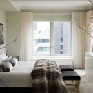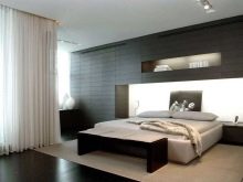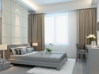 - Minimalismus herrscht im Schlafzimmer Design - hier ist kurzer Tüll mit langen Vorhängen angebracht.