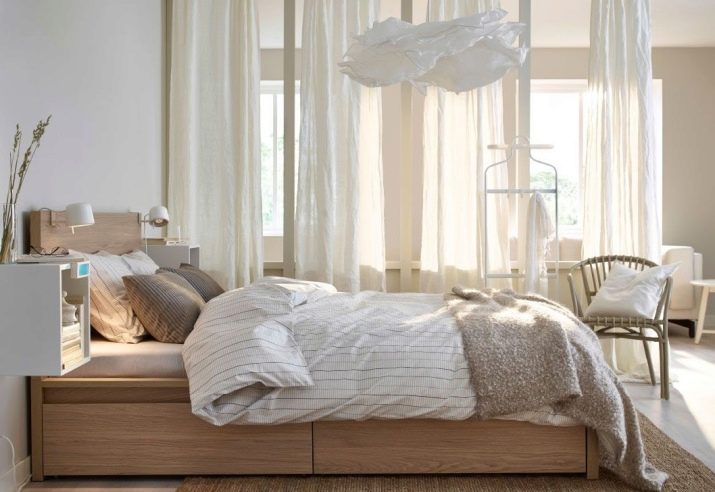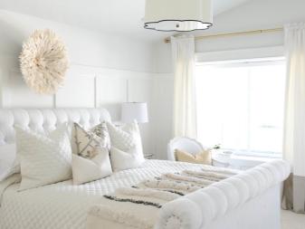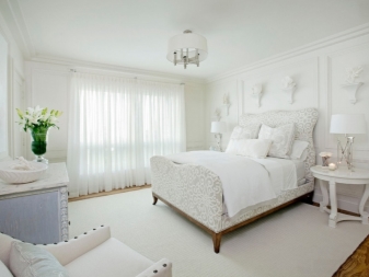 Tüllvorhänge zerstreuen das Licht vom Fenster, vervollständigen das Design der Fensteröffnung und schaffen eine ruhige Stimmung, die im Schlafraum so notwendig ist.