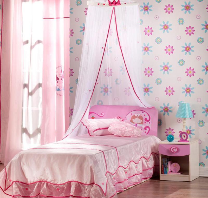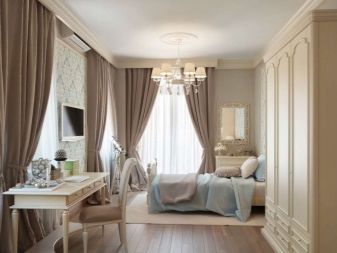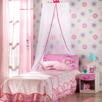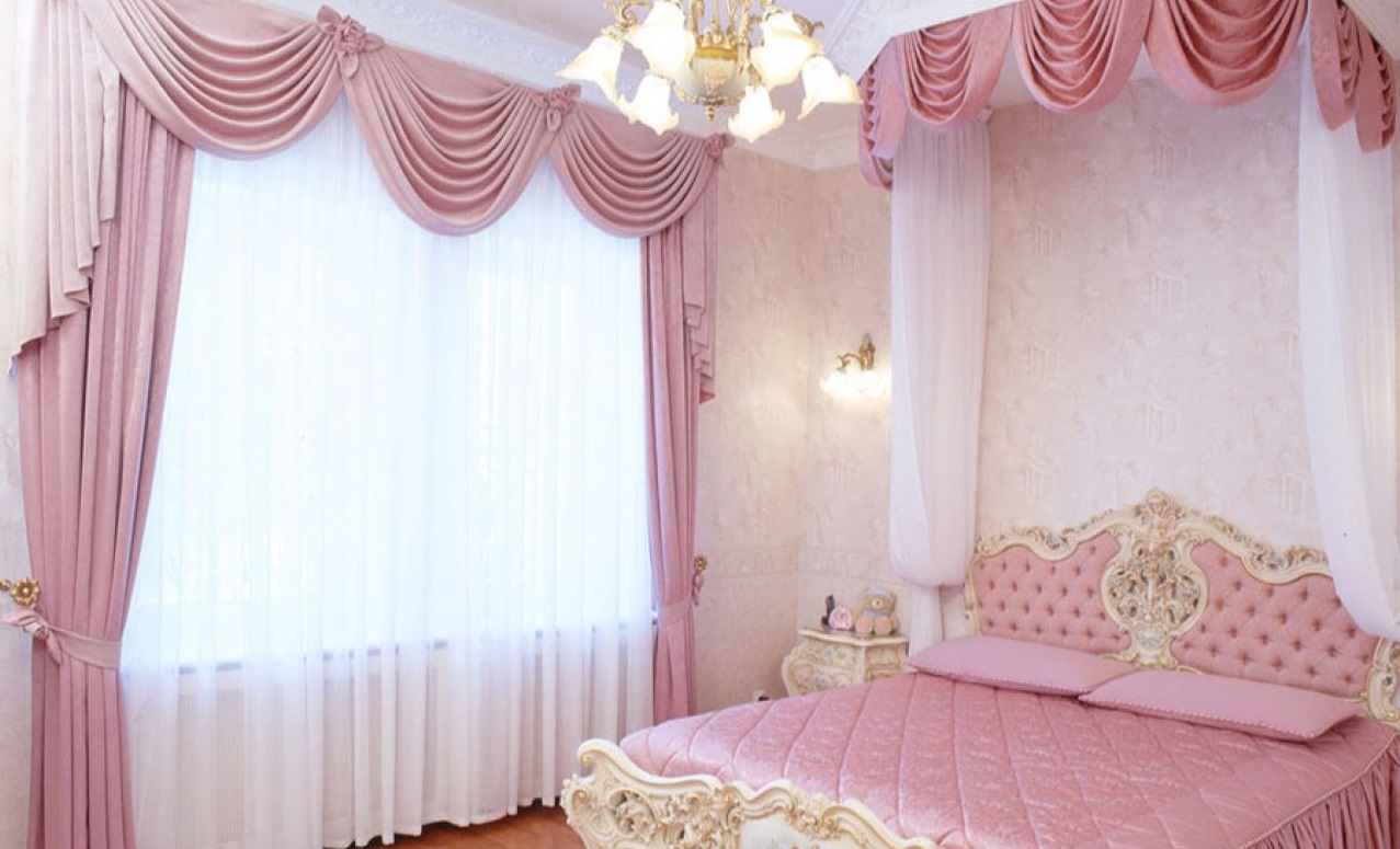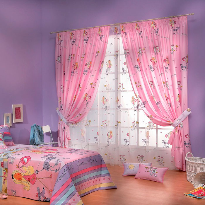 In der Schlafzimmerdekoration des Mädchens spielt Dekoration eine große Rolle in der Bildung eines fabelhaften Bildes. Tüll zeichnet sich durch eine Fülle von Veredelungstechniken aus: Falten, Rüschen, Aufbauten und Haken in verschiedenen Formen. Natürlich ist die Hauptfarbe rosa, aber Pfirsich, Orange und Gelb sind möglich. Oft gefundene Farbe Tüll oder Organza. Und natürlich eine Menge Dekor für einfache Vorhänge: Glasperlen, Perlen, verschiedene Blumen.