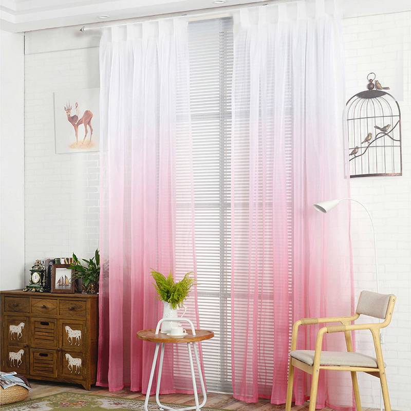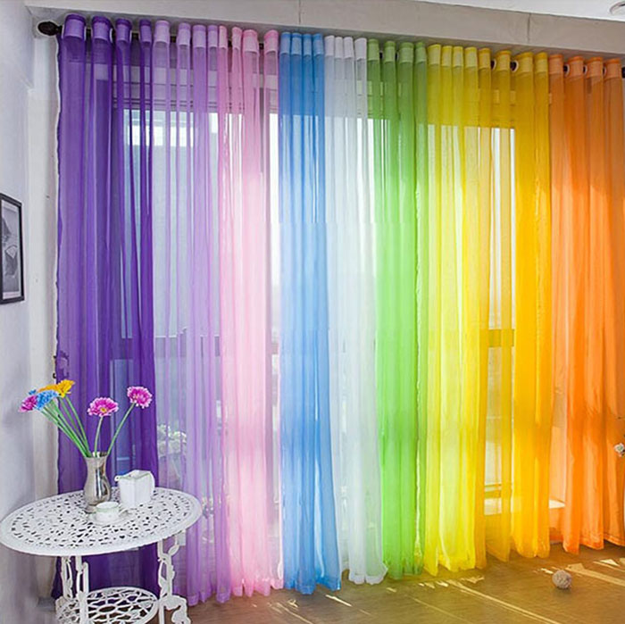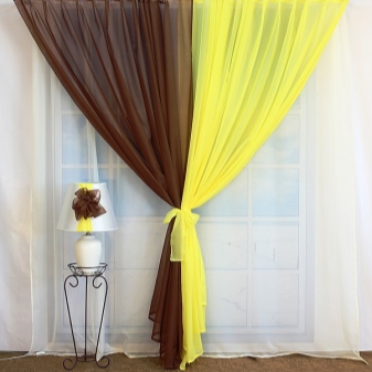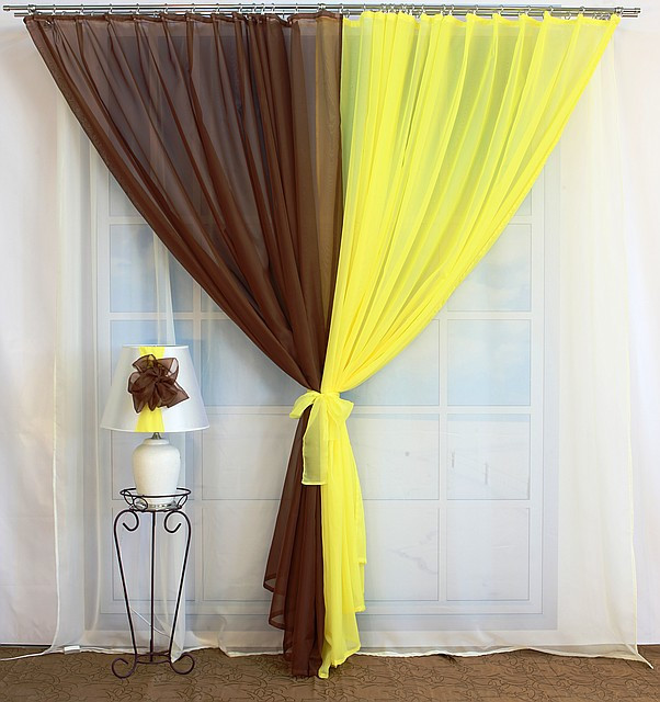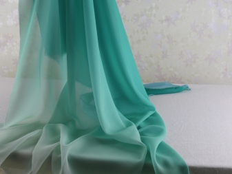 - Schleier Ein sehr dünnes Material mit einem Gewebe, das die maximale Menge an Tageslicht durchlässt. Es ist aus Baumwolle und Seidenfasern hergestellt. Es kann monophon sein, es ist möglich, gedrucktes Muster. Falten bilden mit Hilfe von Drapierungen die notwendige Breite. Die extreme Weichheit des Schleiers erfordert jedoch eine sorgfältige Handhabung.