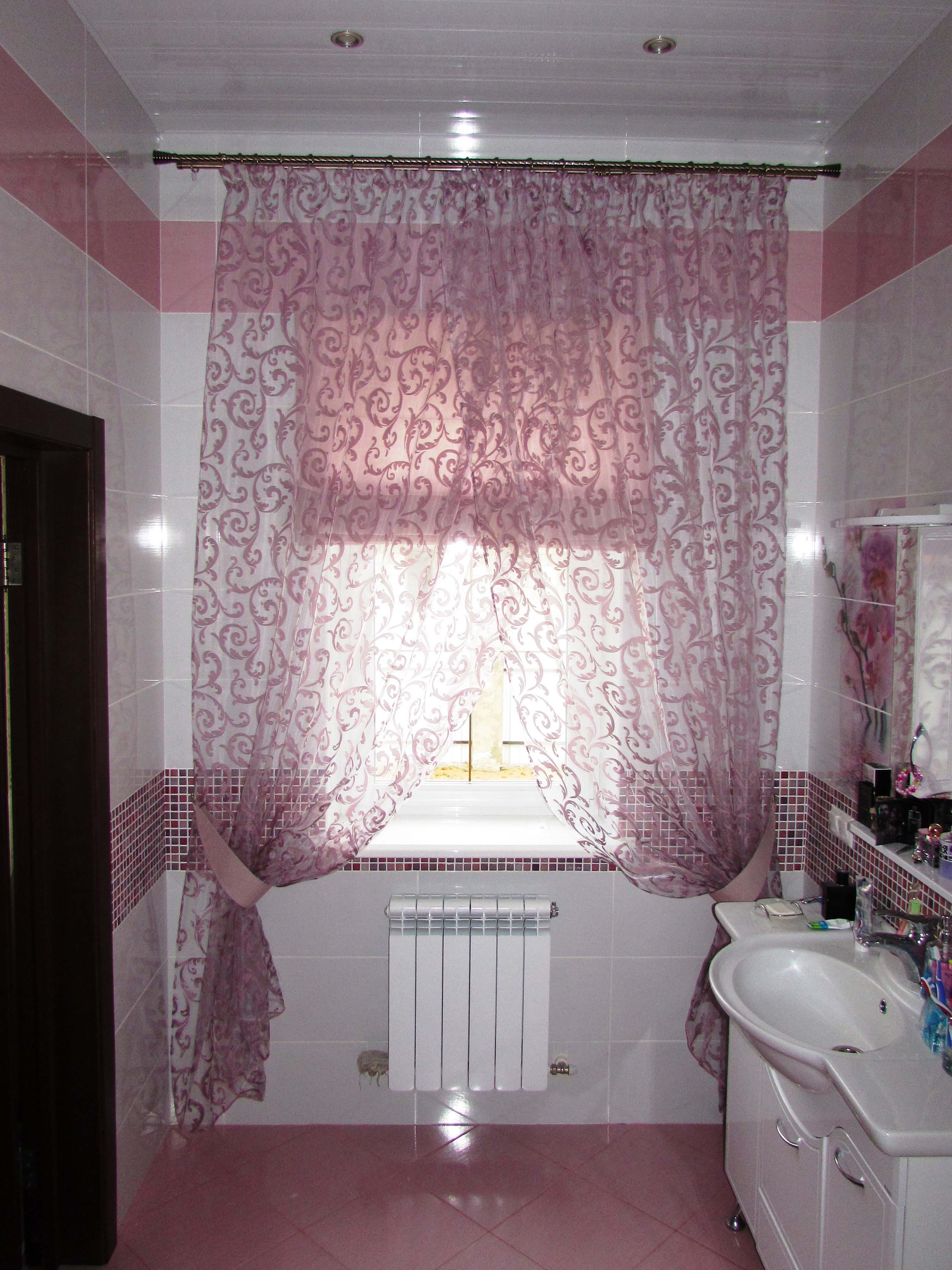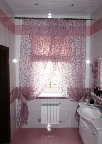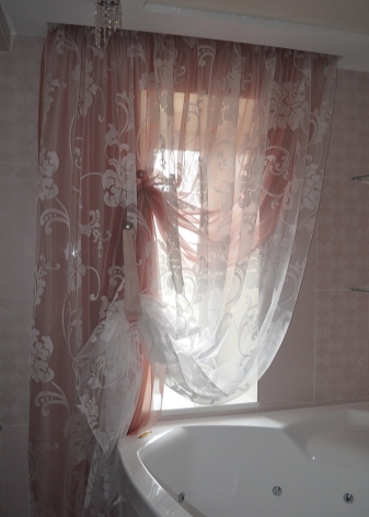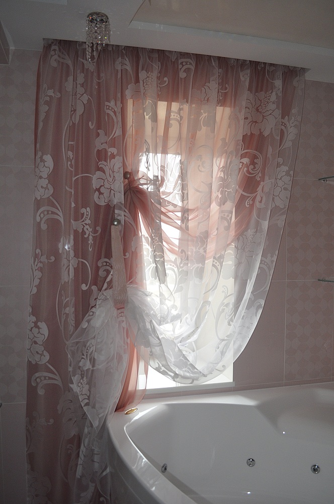 Einige große Apartments oder Ferienhäuser haben ein Bad neben dem Schlafzimmer. Im Badezimmer passender Tüllvorhang aus opakem Material. Vielleicht eine Kombination von Vorhängen mit Rollos oder Multi-Layer-Design.