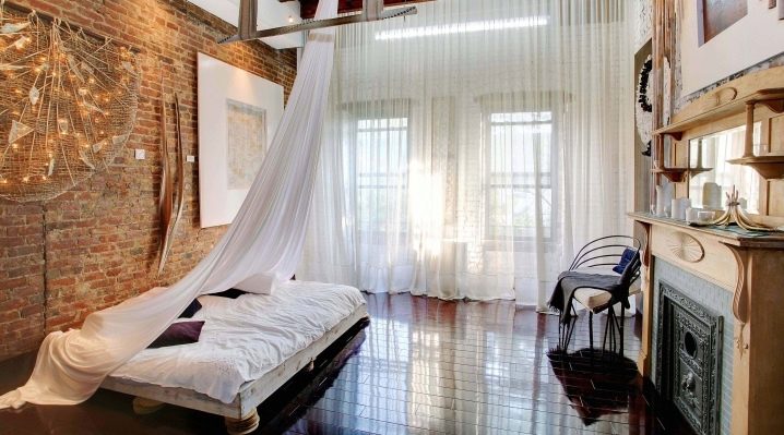 Der moderne Loftstil zeichnet sich durch die fast völlige Abwesenheit von Fensterdekoration aus. Aber es gibt Ausnahmen. Zum Beispiel, wenn das Schlafzimmer große Fensteröffnungen hat, die typisch für Industriegebäude sind. Um die Brutalität des Industriedesigns zu mildern, ist es erlaubt, schneeweißen Tüll mit einer Fülle von vertikalen Falten zu verwenden.