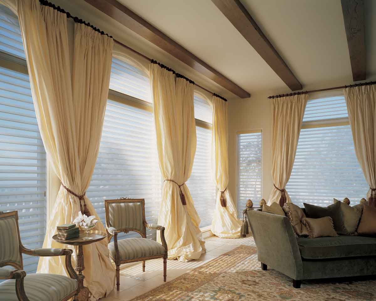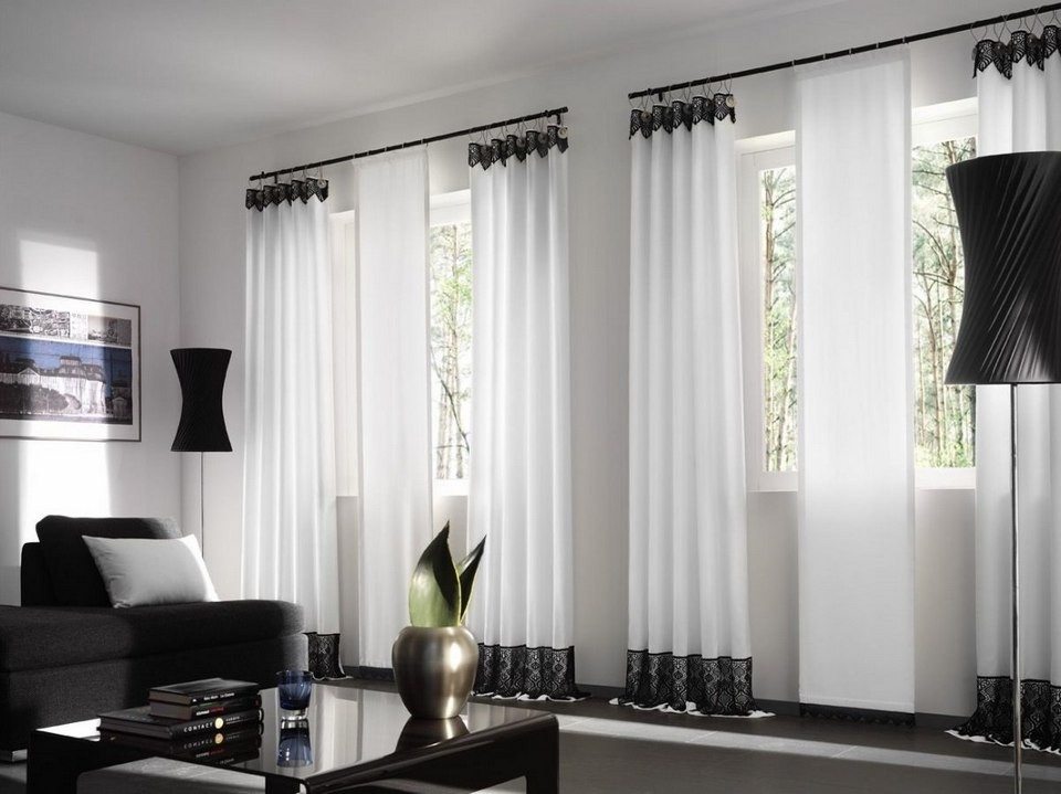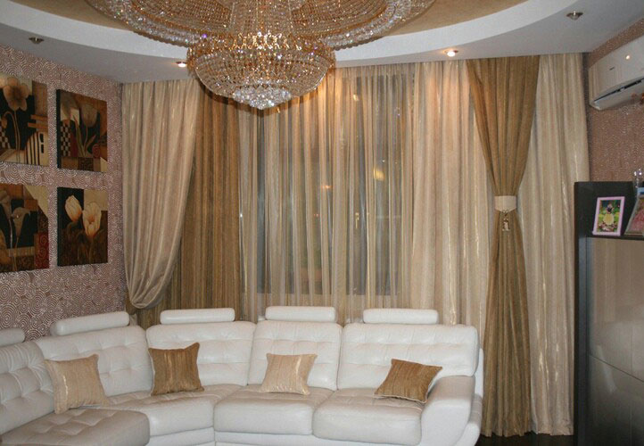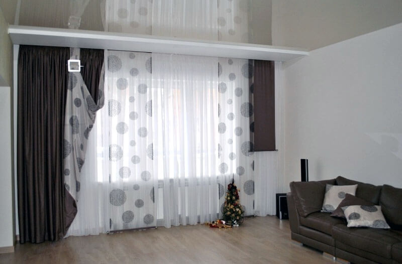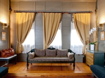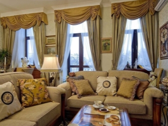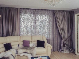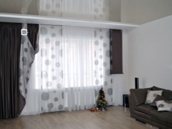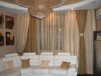 Selten gibt es eine Situation, wenn im Wohnzimmer - nur eine Öffnung. Wenn es mehrere gibt, können die Vorhänge sowohl völlig identisch verwendet werden, als auch durch eins wiederholt werden, und die verschiedenartigsten im Aussehen (abhängig von der Symmetrie). Es ist sehr wichtig, eine homogene Art von Materie zu verwenden.