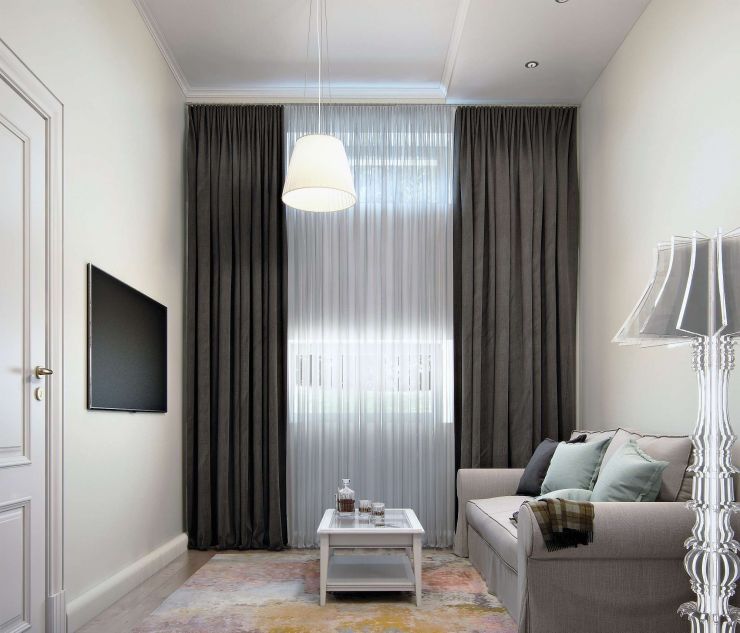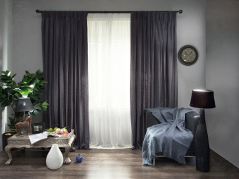 Ein ausgezeichneter Schritt ist die Kombination von hellen Vorhängen selbst mit dunklen Beschlägen und dem gleichen Gesims, dies macht den Auftritt klarer und konstruktiver. Anstelle von Ösen lohnt es sich manchmal, die Vorhänge mit Hilfe von Flip-Loops an den Stäben zu befestigen, da sie den Stoff ohne Beschläge halten können.