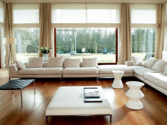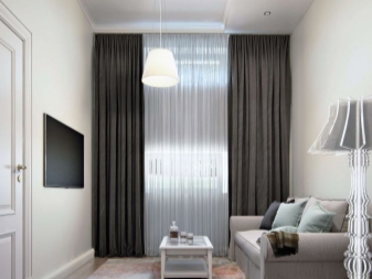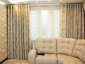 Ein großes Fenster (Panoramatyp) ist so konzipiert, dass die Vorhänge nicht nur dem Stil des Wohnzimmers entsprechen, sondern auch der Aussicht, die sich hinter dem Fenster öffnet. So werden Industrielandschaften gut mit Minimalismus und Loft im Inneren kombiniert, und wenn Sie ein Wohnhaus, einen Spielplatz, dann müssen Sie die Klassiker wählen.