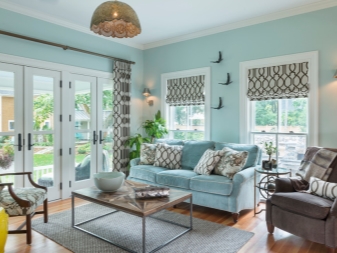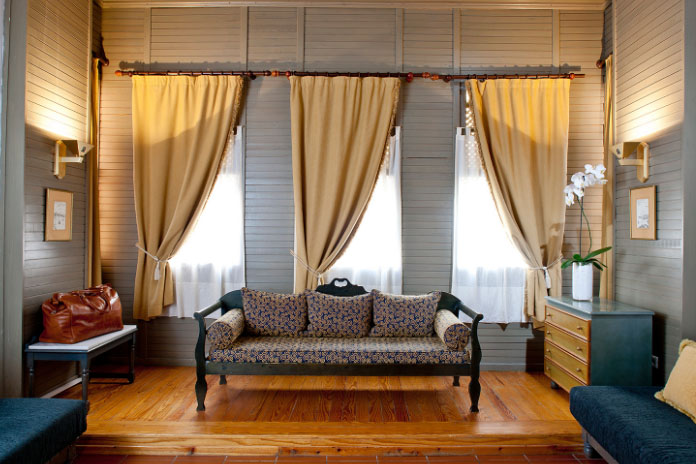 Fast stören Sie nicht die Beobachtung des Panoramas der hellblauen Fensterläden; in diesem Fall kann das Hauptakzentelement durch gelbliche Vorhänge dargestellt werden, die in einem Rollmuster zusammengefügt und gebunden werden.