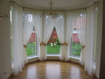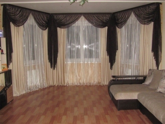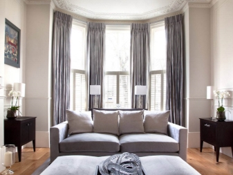Zusätzlich zu der Auswahl der Art der Vorhänge und ihres Materials ist es notwendig, die Art des am meisten dekorierten Fensters zu berücksichtigen. Das Erkerfenster ist in den äußeren Teilen der Wände installiert, obwohl solche Vorsprünge mit Balkontüren ausgestattet sein können. Ein solcher Schritt wird die Nutzfläche im Haus deutlich erhöhen, die Ausleuchtung des Gästebereichs erhöhen.