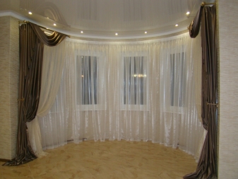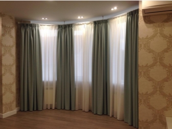 Nach Ansicht der Designer sind Erkerfenster gut mit Fadenvorhängen von irisierender Farbe kompatibel. Die Traufe sollte so gewählt werden, dass sie mit der Linie der Wand entlang der gesamten Decke übereinstimmt und sicher befestigt ist, da Sie zwei oder sogar drei Schichten dicke Vorhänge behalten müssen.