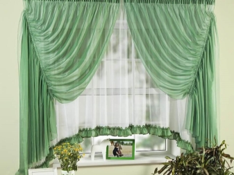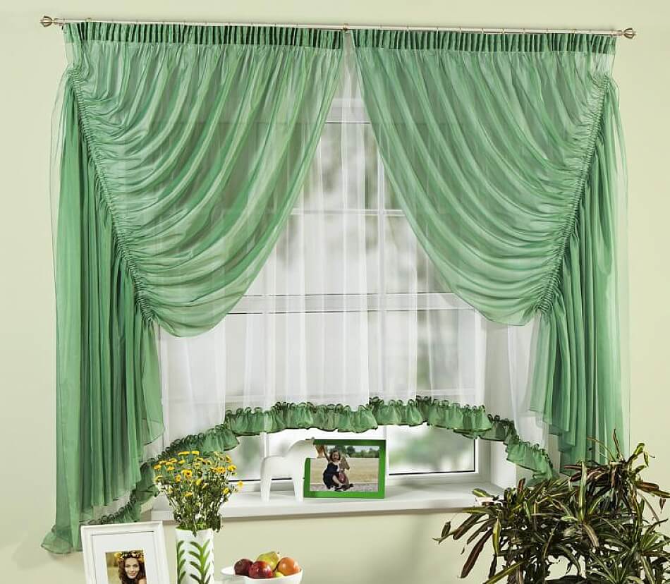 Ein klassischer rechteckiger Anhänger kann nicht weniger dekorativ sein, wenn Sie Vorhänge von zwei Farben verwenden (sagen wir vor dem Grün und näher am Fenster von Weiß).Es ist ratsam, diese Teile nicht visuell zusammenzufassen, da ein solcher Schritt die Wahrnehmung des Innenraums stark verbessern wird.