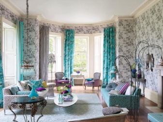 Kurze Streifen von Materie und alle Lösungen, bei denen die Zeichnung diagonal ausgerichtet ist, sind auch nicht mit Panoramafenstern kompatibel, dies ist eine sehr unbequeme Ausführung.