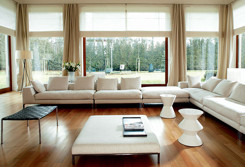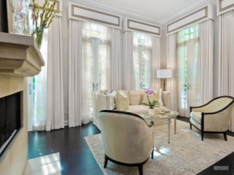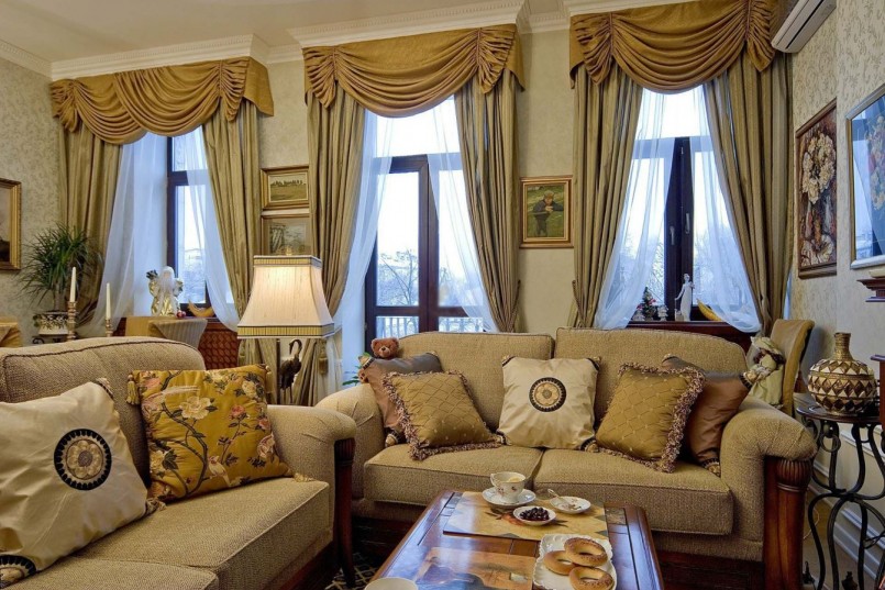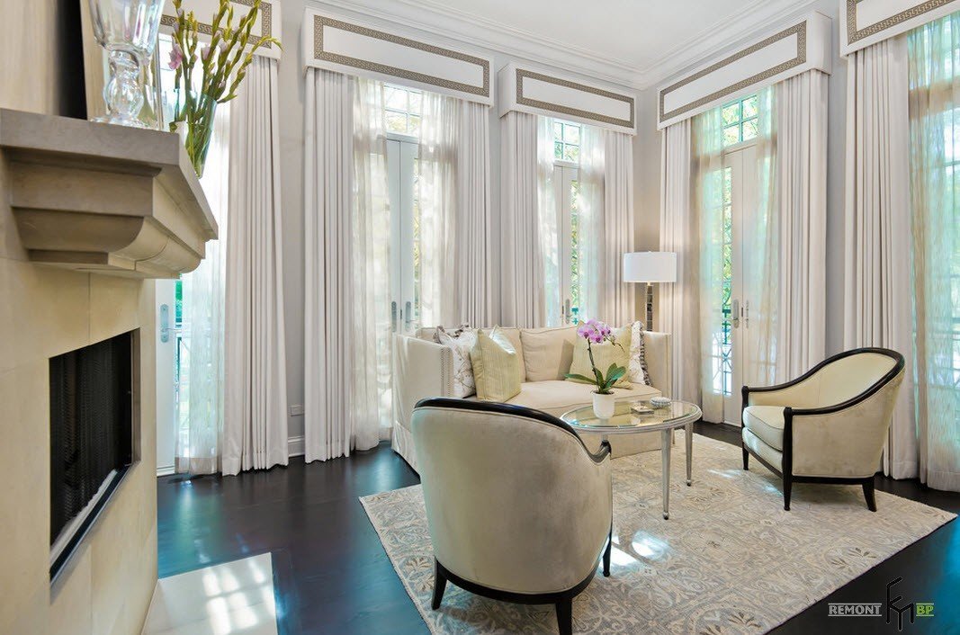 Wenn bekannt ist, dass es im Wohnzimmer zwei oder drei Fenster gibt, reicht das noch nicht aus, um die richtige Entscheidung zu treffen. Ein Ansatz sollte sein, wenn Sie sie auf zusammenhängenden Wänden platzieren. Andere - wenn sie alle an einer der Wände sind. Die wichtigste unveränderliche Regel ist die vollständige Identität aller Öffnungen, mit Ausnahme der Asymmetrie im klassischen Innenraum. Ein kleiner Unterschied kann nur in einem modernen Umfeld erreicht werden.