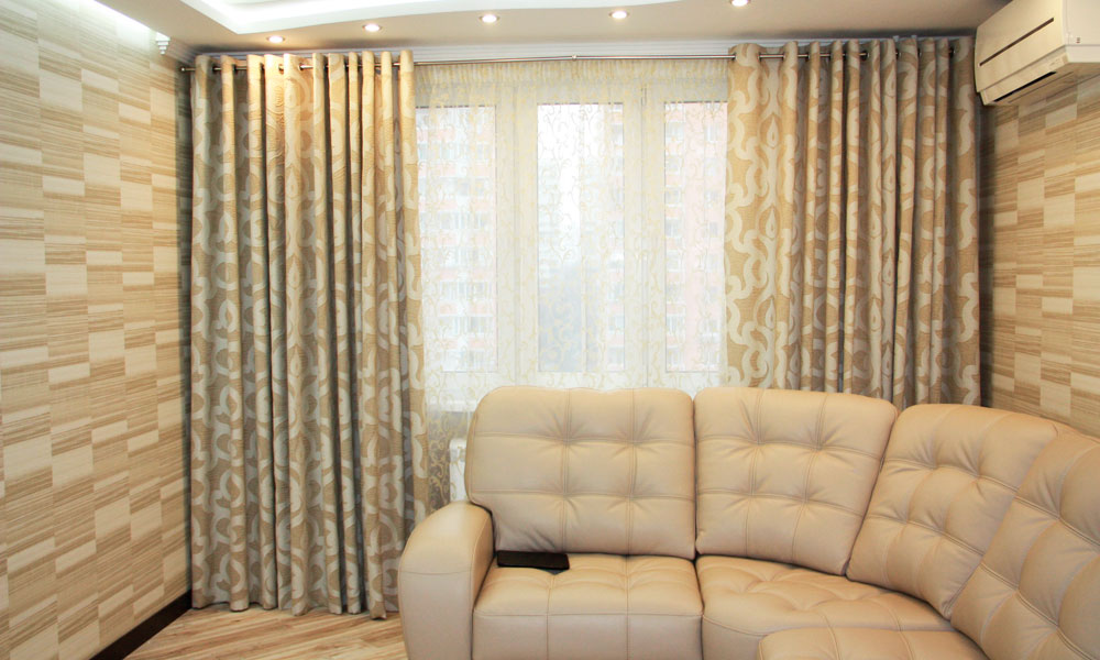 Es ist kategorisch inakzeptabel, Vorhänge mit kleinen Mustern zu verwenden, da sie in einem großen Raum optisch verloren gehen.