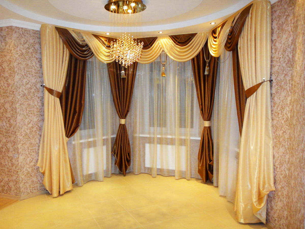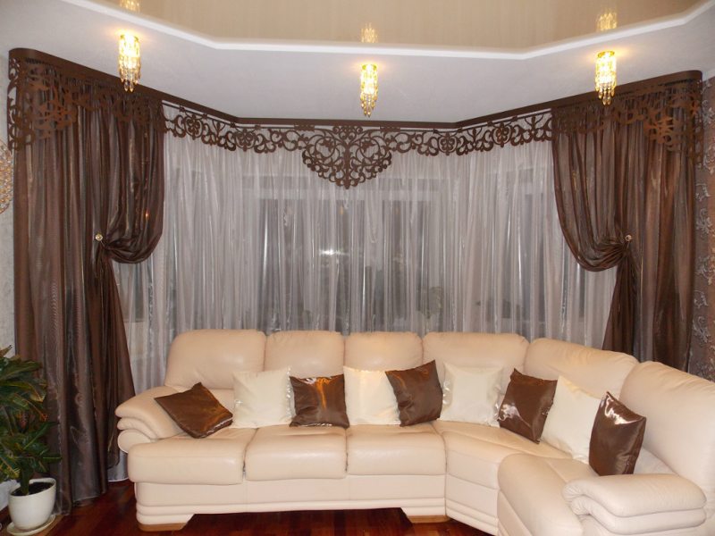 Aber es ist besser, Mehrschichtkonstruktionen mit Lambrequins mit geschlossenen Baguettes zu kombinieren. Fadenvorhangstangen können nicht gebogen werden und sind daher in den Erkervarianten nicht akzeptabel. Der einfachste Weg, die gewünschte Krümmung einzustellen, ist ein Metallrohr.