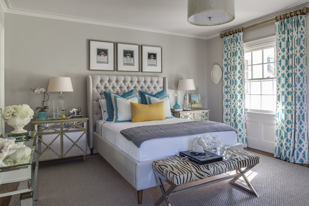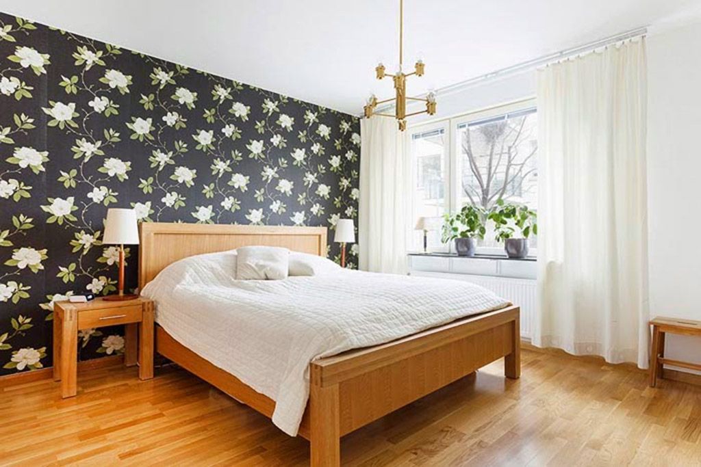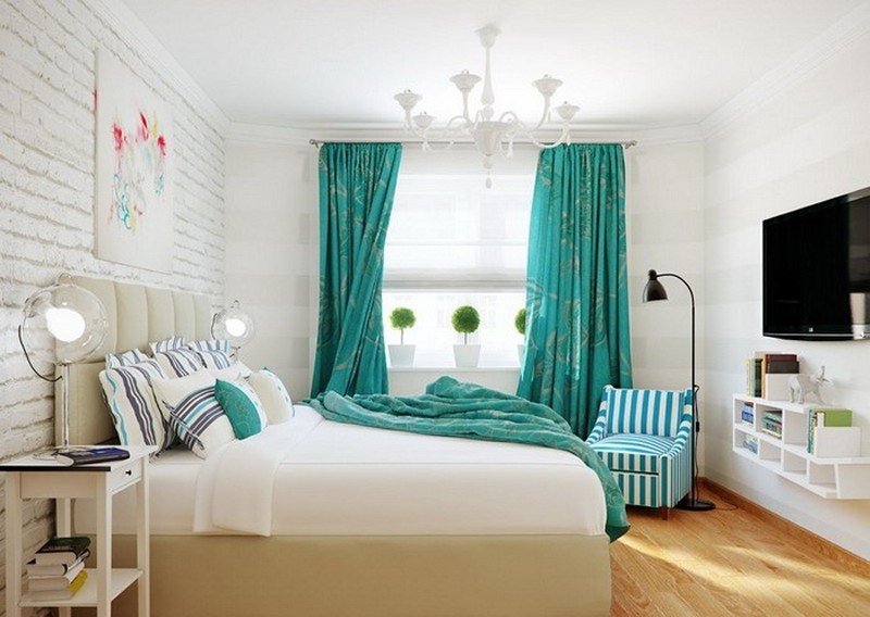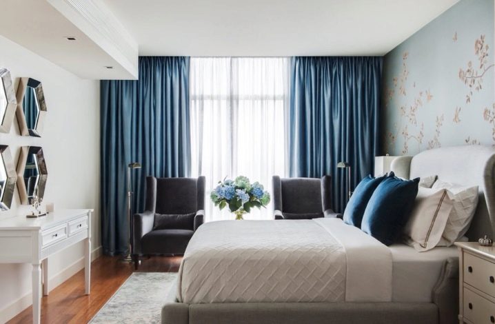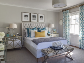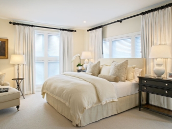 Für das Schlafzimmer können Sie die gleichen Vorhänge wie für das Wohnzimmer aufheben. Zusätzlich lohnt es sich jedoch, an den Fenstern im Schlafzimmer Jalousien oder Rollos anzubringen, damit Sie bei Bedarf die Sicht von außen nach außen fest verschließen können.