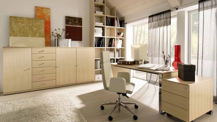 Wenn Sie Ihr Büro im skandinavischen Stil ausstatten möchten, das Die ideale Lösung wäre die Verwendung von durchscheinenden blauen Vorhängen mit gedämpften Tönen. Dies wird einige Strenge geben und ein angenehmes Geschäftsumfeld schaffen.