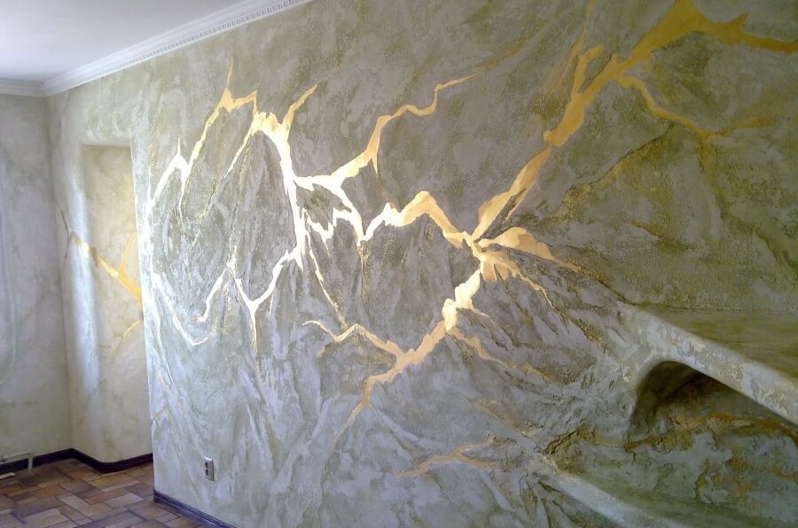 - Polymer Gips.Aufgrund der Anwesenheit in der Zusammensetzung von Acrylharzen ist einer der beständigsten gegenüber Temperaturschwankungen und hoher Luftfeuchtigkeit. Solches Material lässt sich leicht auf jede Art von Oberfläche auftragen und ist in der Lage, Marmor oder Leder zu imitieren.