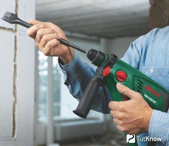Wenn der Spachtel ziemlich fest an der Wand hält und sich nicht für die manuelle Entfernung eignet, dann lohnt sich in diesem Fall der Einsatz von "schwerer Artillerie".Am besten als Perforator mit einer Schockfunktion dienen. Dazu wird eine spezielle Düse in der Buchse fixiert und das Werkzeug in den Schlagmodus versetzt.